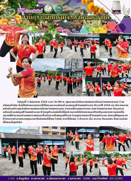 วันพุธที่ 3 กันยายน 2568 เวลา 16.00 น. บุคลากรสำนักงานสหกรณ์จังหวัดนครนายก ร่วมเต้นแอโรบิค ซึ่งเป็นกิจกรรมภายใต้โครงการเสริมสร้างสมดุลชีวิตคนทำงาน ประจำปี 2568 ณ บริเวณลานหน้าห้องประชุมสำนักงานสหกรณ์จังหวัดนครนายก อำเภอเมืองนครนายก จังหวัดนครนายก โครงการเสริมสร้างสมดุลชีวิตคนทำงาน มีวัตถุประสงค์เพื่อให้หน่วยงานได้พัฒนาและปรับปรุงสภาพแวดล้อมในสถานที่ทำงานอย่างเหมาะสมและเอื้อต่อการมีสมดุลที่ดีระหว่างสุขภาพและชีวิตคนทำงาน ส่งผลให้คุณภาพชีวิตการทำงานของบุคลากรในสังกัดดีขึ้นกว่าเดิม ภายใต้หลัก 4 ประการ คือ สะอาด ปลอดภัย สิ่งแวดล้อมที่ดีและมีสุขนิสัย
