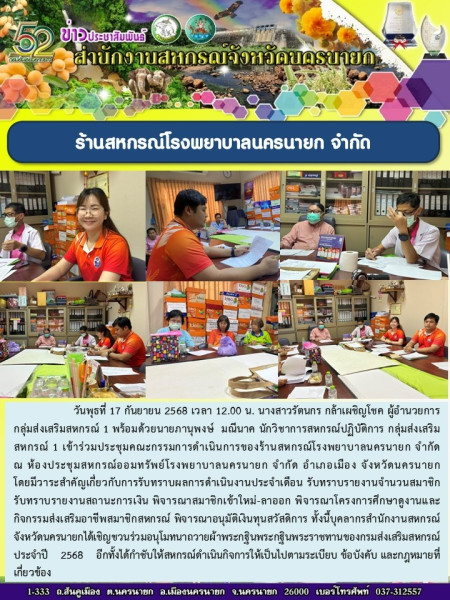 วันพุธที่ 17 กันยายน 2568 เวลา 12.00 น. นางสาวรัตนกร กล้าเผชิญโชค ผู้อำนวยการกลุ่มส่งเสริมสหกรณ์ 1 พร้อมด้วยนายภานุพงษ์ มณีนาค นักวิชาการสหกรณ์ปฏิบัติการ กลุ่มส่งเสริมสหกรณ์ 1 เข้าร่วมประชุมคณะกรรมการดำเนินการของร้านสหกรณ์โรงพยาบาลนครนายก จำกัด ณ ห้องประชุมสหกรณ์ออมทรัพย์โรงพยาบาลนครนายก จำกัด อำเภอเมือง จังหวัดนครนายก โดยมีวาระสำคัญเกี่ยวกับการรับทราบผลการดำเนินงานประจำเดือน รับทราบรายงานจำนวนสมาชิก รับทราบรายงานสถานะการเงิน พิจารณาสมาชิกเข้าใหม่-ลาออก พิจารณาโครงการศึกษาดูงานและกิจกรรมส่งเสริมอาชีพสมาชิกสหกรณ์ พิจารณาอนุมัติเงินทุนสวัสดิการ ทั้งนี้บุคลากรสำนักงานสหกรณ์จังหวัดนครนายกได้เชิญชวนร่วมอนุโมทนาถวายผ้าพระกฐินพระกฐินพระราชทานของกรมส่งเสริมสหกรณ์ ประจำปี 2568 อีกทั้งได้กำชับให้สหกรณ์ดำเนินกิจการให้เป็นไปตามระเบียบ ข้อบังคับ และกฎหมายที่เกี่ยวข้อง