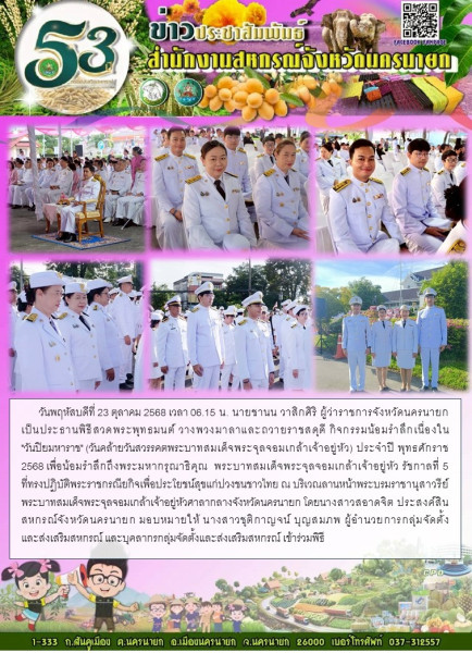 วันพฤหัสบดีที่ 23 ตุลาคม 2568 เวลา 06.15 น. นายชานน วาสิกศิริ ผู้ว่าราชการจังหวัดนครนายก เป็นประธานพิธีสวดพระพุทธมนต์ วางพวงมาลาและถวายราชสดุดี กิจกรรมน้อมรำลึกเนื่องใน "วันปิยมหาราช" (วันคล้ายวันสวรรคตพระบาทสมเด็จพระจุลจอมเกล้าเจ้าอยู่หัว) ประจำปี พุทธศักราช 2568 เพื่อน้อมรำลึกถึงพระมหากรุณาธิคุณ พระบาทสมเด็จพระจุลจอมเกล้าเจ้าอยู่หัว รัชกาลที่ 5 ที่ทรงปฏิบัติพระราชกรณียกิจเพื่อประโยชน์สุขแก่ปวงชนชาวไทย ณ บริเวณลานหน้าพระบรมราชานุสาวรีย์พระบาทสมเด็จพระจุลจอมเกล้าเจ้าอยู่หัวศาลากลางจังหวัดนครนายก โดยนางสาวสอาดจิต ประสงค์สิน สหกรณ์จังหวัดนครนายก มอบหมายให้ นางสาวชุติกาญจน์ บุญสมภพ ผู้อำนวยการกลุ่มจัดตั้งและส่งเสริมสหกรณ์ และบุคลากรกลุ่มจัดตั้งและส่งเสริมสหกรณ์ เข้าร่วมพิธี