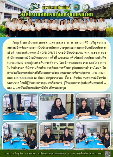 วันพุธที่ 25 มีนาคม 2569 เวลา 13.30 น. นางสาวเกศินี เจริญสุวรรณ สหกรณ์จังหวัดนครนายก เป็นประธานในการประชุมคณะกรรมการขับเคลื่อนนโยบายอธิบดีกรมส่งเสริมสหกรณ์ (CPD DRIVE ) ประจำปีงบประมาณ พ.ศ. 2569 ของสำนักงานสหกรณ์จังหวัดนครนายก ครั้งที่ 1/2569 เพื่อขับเคลื่อนนโยบายอธิบดีฯ (CPD DRIVE) และมุ่งยกระดับการทำงาน โดยมีการเสนอผลงาน และโครงการในสำนักงานฯ ที่มีความคิดสร้างสรรค์และการพัฒนารูปแบบการทำงานใหม่ๆ ในการส่งเสริมสหกรณ์อย่างยั่งยืน และการส่งผลงานตามเกณฑ์การประกวด CPD DRIVE และ CPD SANDBOX ณ ห้องประชุมนางรอง ชั้น 2 สำนักงานสหกรณ์จังหวัดนครนายก โดยมีผู้อำนวยการกลุ่มงานวิชาการ, ผู้อำนวยการกลุ่มส่งเสริมสหกรณ์ 1 และ 2 และหัวหน้าฝ่ายบริหารทั่วไป เข้าร่วมประชุม