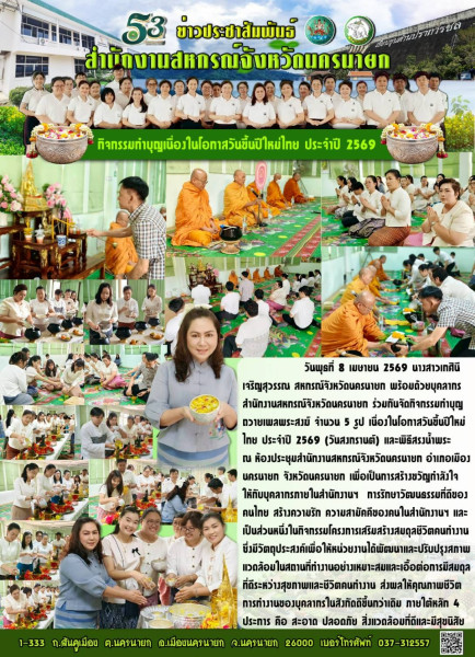 วันพุธที่ 8 เมษายน 2569 นางสาวเกศินี เจริญสุวรรณ สหกรณ์จังหวัดนครนายก พร้อมด้วย บุคลากรสำนักงานสหกรณ์จังหวัดนครนายก ร่วมกันจัดกิจกรรมทำบุญถวายเพลพระสงฆ์ จำนวน 5 รูป เนื่องในโอกาสวันขึ้นปีใหม่ไทย ประจำปี 2569 (วันสงกรานต์) และพิธีสรงน้ำพระ ณ ห้องประชุมสำนักงานสหกรณ์จังหวัดนครนายก อำเภอเมืองนครนายก จังหวัดนครนายก เพื่อเป็นการสร้างขวัญกำลังใจให้กับบุคลากรภายในสำนักงานฯ การรักษาวัฒนธรรมที่ดีของคนไทย สร้างความรัก ความสามัคคีของคนในสำนักงานฯ และเป็นส่วนหนึ่งในกิจกรรมโครงการเสริมสร้างสมดุลชีวิตคนทำงาน ซึ่งมีวัตถุประสงค์เพื่อให้หน่วยงานได้พัฒนาและปรับปรุงสภาพแวดล้อมในสถานที่ทำงานอย่างเหมาะสมและเอื้อต่อการมีสมดุลที่ดีระหว่างสุขภาพและชีวิตคนทำงาน ส่งผลให้คุณภาพชีวิตการทำงานของบุคลากรในสังกัดดีขึ้นกว่าเดิม ภายใต้หลัก 4 ประการ คือ สะอาด ปลอดภัย สิ่งแวดล้อมที่ดีและมีสุขนิสัย