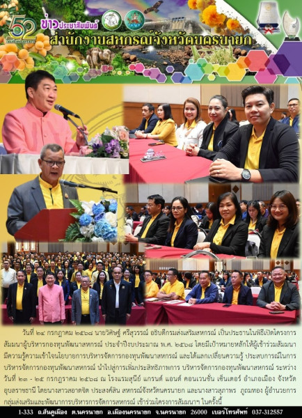 วันที่ 24 กรกฎาคม 2568 นายวิศิษฐ์ ศรีสุวรรณ์ อธิบดีกรมส่งเสริมสหกรณ์ เป็นประธานในพิธีเปิดโครงการสัมมนาผู้บริหารกองทุนพัฒนาสหกรณ์ ประจำปีงบประมาณ พ.ศ. 2568 โดยมีเป้าหมายหลักให้ผู้เข้าร่วมสัมมนา มีความรู้ความเข้าใจนโยบายการบริหารจัดการกองทุนพัฒนาสหกรณ์ และได้แลกเปลี่ยนความรู้ ประสบการณ์ในการบริหารจัดการกองทุนพัฒนาสหกรณ์ นำไปสู่การเพิ่มประสิทธิภาพการ บริหารจัดการกองทุนพัฒนาสหกรณ์ ระหว่างวันที่ 23 - 25 กรกฎราคม 2568 ณ โรงแรมสุนีย์ แกรนด์ แอนด์ คอนเวนชั่น เซ็นเตอร์ อำเภอเมือง จังหวัดอุบลราชธานี โดยนางสาวสอาดจิต ประสงค์สิน สหกรณ์จังหวัดนครนายก และนางสาวสุภาพร ภูถมทอง ผู้อำนวยการกลุ่มส่งเสริมและพัฒนาการบริหารการจัดการสหกรณ์ เข้าร่วมโครงการสัมมนาฯ ในครั้งนี้