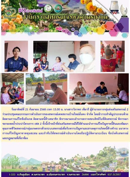 วันอาทิตย์ที่ 21 กันยายน 2568 เวลา 15.00 น. นางสาววิภาพร เขียวรี ผู้อำนวยการกลุ่มส่งเสริมสหกรณ์ 2 ร่วมประชุมคณะกรรมการดำเนินการของสหกรณ์เคหสถานบ้านใหม่มั่นคง จำกัด โดยมีวาระสำคัญประกอบด้วยติดตามการแก้ไขข้อสังเกต ติดตามหนี้ค้างสมาชิก พิจารณามอบอำนาจตรวจสอบสิทธิในที่ดินสหกรณ์ พิจารณาขยายเขตน้ำประปาโครงการ เฟส 2 ทั้งนี้เจ้าหน้าที่ส่งเสริมสหกรณ์ได้ให้คำแนะนำการแก้ไขปัญหาหนี้สินและพัฒนาคุณภาพชีวิตสหกรณ์/กลุ่มเกษตรกรด้วยระบบสหกรณ์เพื่อรับทราบปัญหาและสาเหตุการเกิดหนี้ค้างชำระ แนวทางการแก้ไขปัญหาขาดทุนสะสม และกำชับให้สหกรณ์ดำเนินงานโดยถือปฏิบัติตามระเบียบ ข้อบังคับสหกรณ์และกฎหมายที่เกี่ยวข้อง