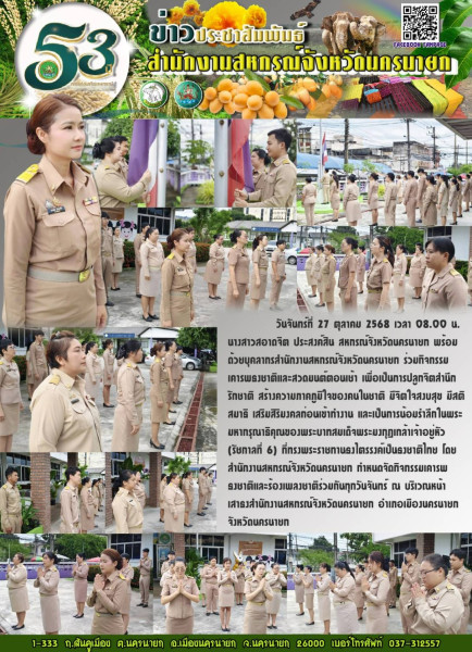 วันจันทร์ที่ 27 ตุลาคม 2568 เวลา 08.00 น. นางสาวสอาดจิต ประสงค์สิน สหกรณ์จังหวัดนครนายก พร้อมด้วยบุคลากรสำนักงานสหกรณ์จังหวัดนครนายก ร่วมกิจกรรมเคารพธงชาติและสวดมนต์ตอนเช้า เพื่อเป็นการปลูกจิตสำนึกรักชาติ สร้างความภาคภูมิใจของคนในชาติ มีจิตใจสงบสุข มีสติ สมาธิ เสริมสิริมงคลก่อนเข้าทำงาน และเป็นการน้อมรำลึกในพระมหากรุณาธิคุณของพระบาทสมเด็จพระมงกุฎเกล้าเจ้าอยู่หัว (รัชกาลที่ 6) ที่ทรงพระราชทานธงไตรรงค์เป็นธงชาติไทย โดยสำนักงานสหกรณ์จังหวัดนครนายก กำหนดจัดกิจกรรมเคารพธงชาติและร้องเพลงชาติร่วมกันทุกวันจันทร์ ณ บริเวณหน้าเสาธงสำนักงานสหกรณ์จังหวัดนครนายก อำเภอเมืองนครนายก จังหวัดนครนายก