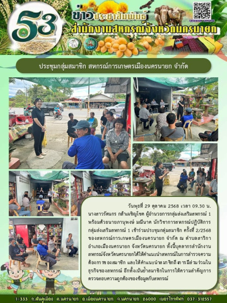 วันพุธที่ 29 ตุลาคม 2568 เวลา 09.30 น. นางสาวรัตนกร กล้าเผชิญโชค ผู้อำนวยการกลุ่มส่งเสริมสหกรณ์ 1 พร้อมด้วยนายภานุพงษ์ มณีนาค นักวิชาการสหกรณ์ปฏิบัติการ กลุ่มส่งเสริมสหกรณ์ 1 เข้าร่วมประชุมกลุ่มสมาชิก ครั้งที่ 2/2568 ของสหกรณ์การเกษตรเมืองนครนายก จำกัด ณ ตำบลสาริกา อำเภอเมืองนครนายก จังหวัดนครนายก ทั้งนี้บุคลากรสำนักงานสหกรณ์จังหวัดนครนายกได้ให้คำแนะนำสหกรณ์ในการสำรวจความต้องการของสมาชิก และให้คำแนะนำสมาชิกถึงการมีส่วนร่วมในธุรกิจของสหกรณ์ อีกทั้งเน้นย้ำสมาชิกในการให้ความสำคัญการตรวจสอบความถูกต้องของข้อมูลกับสหกรณ์